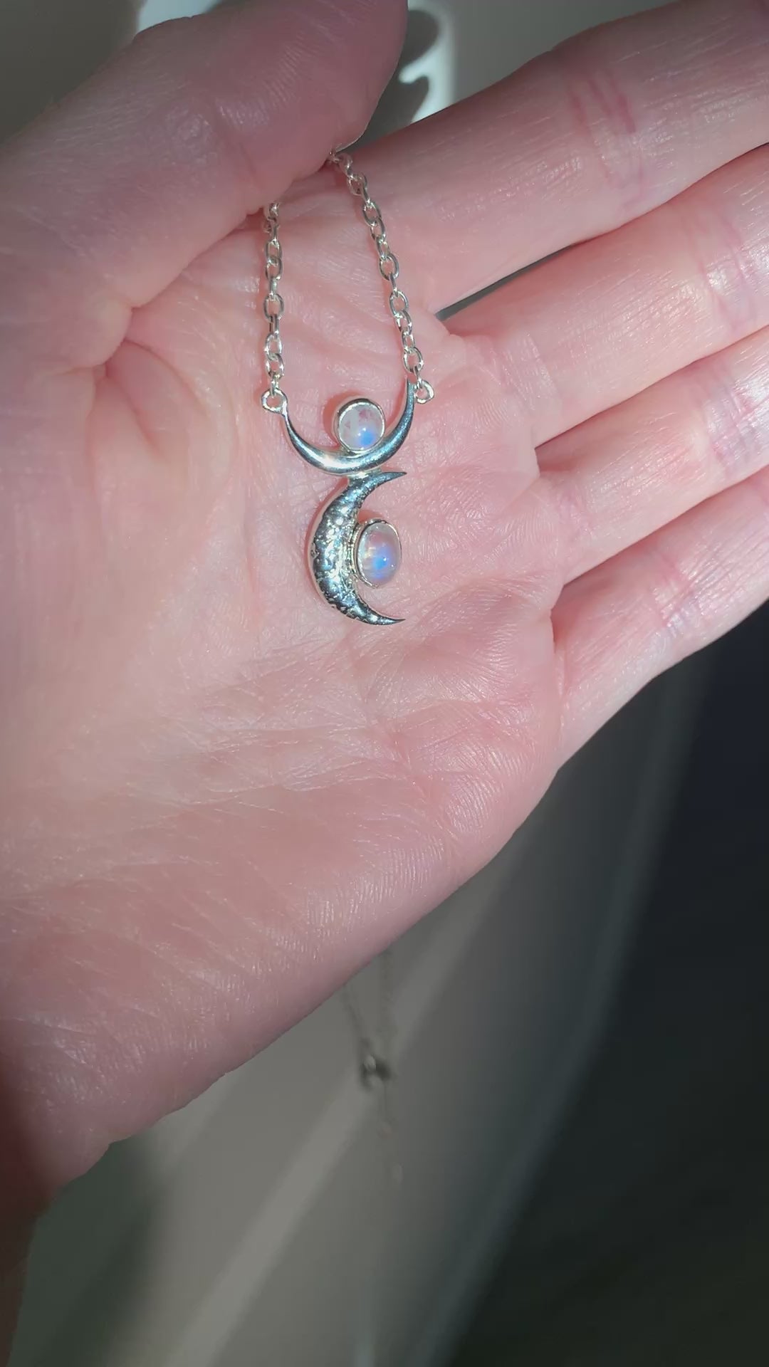 Smykket har en månestein som skifter mellom hvite og blå nyanser, og minner om ro, rytme og bevegelse.