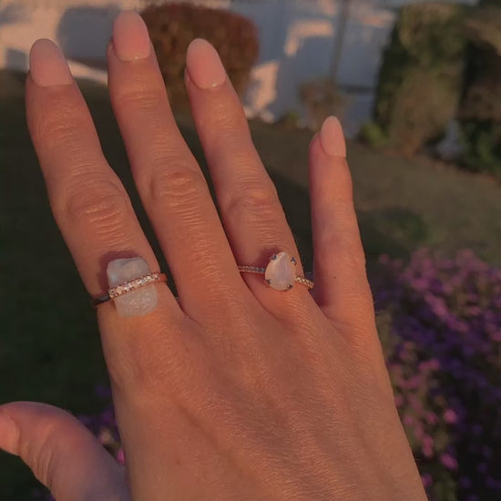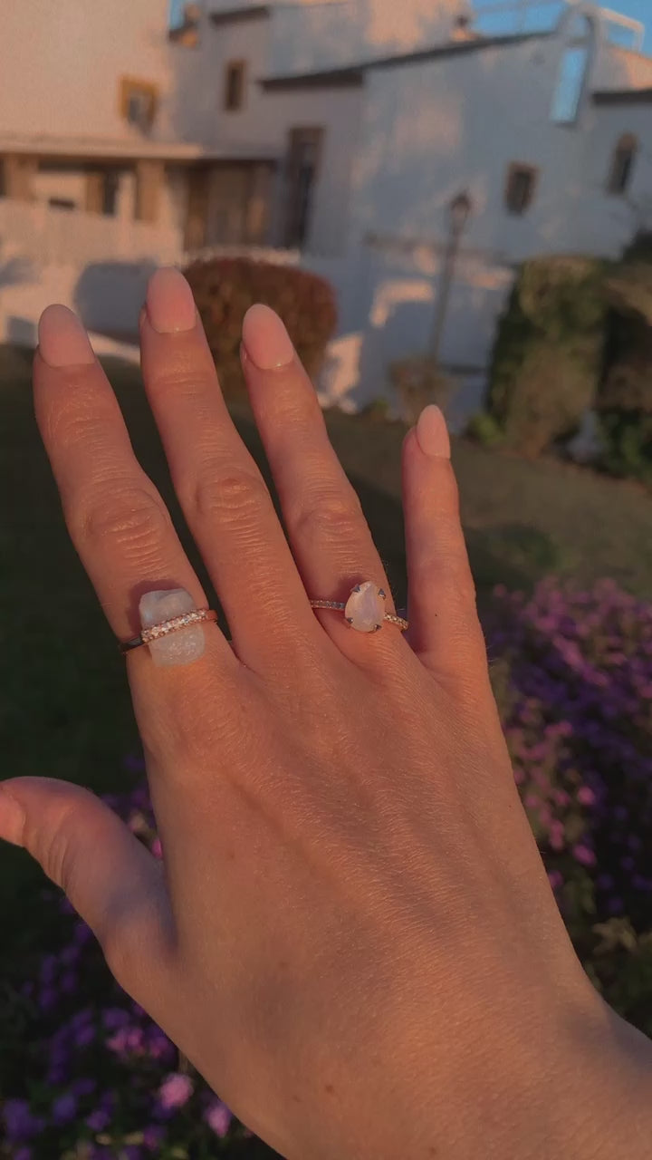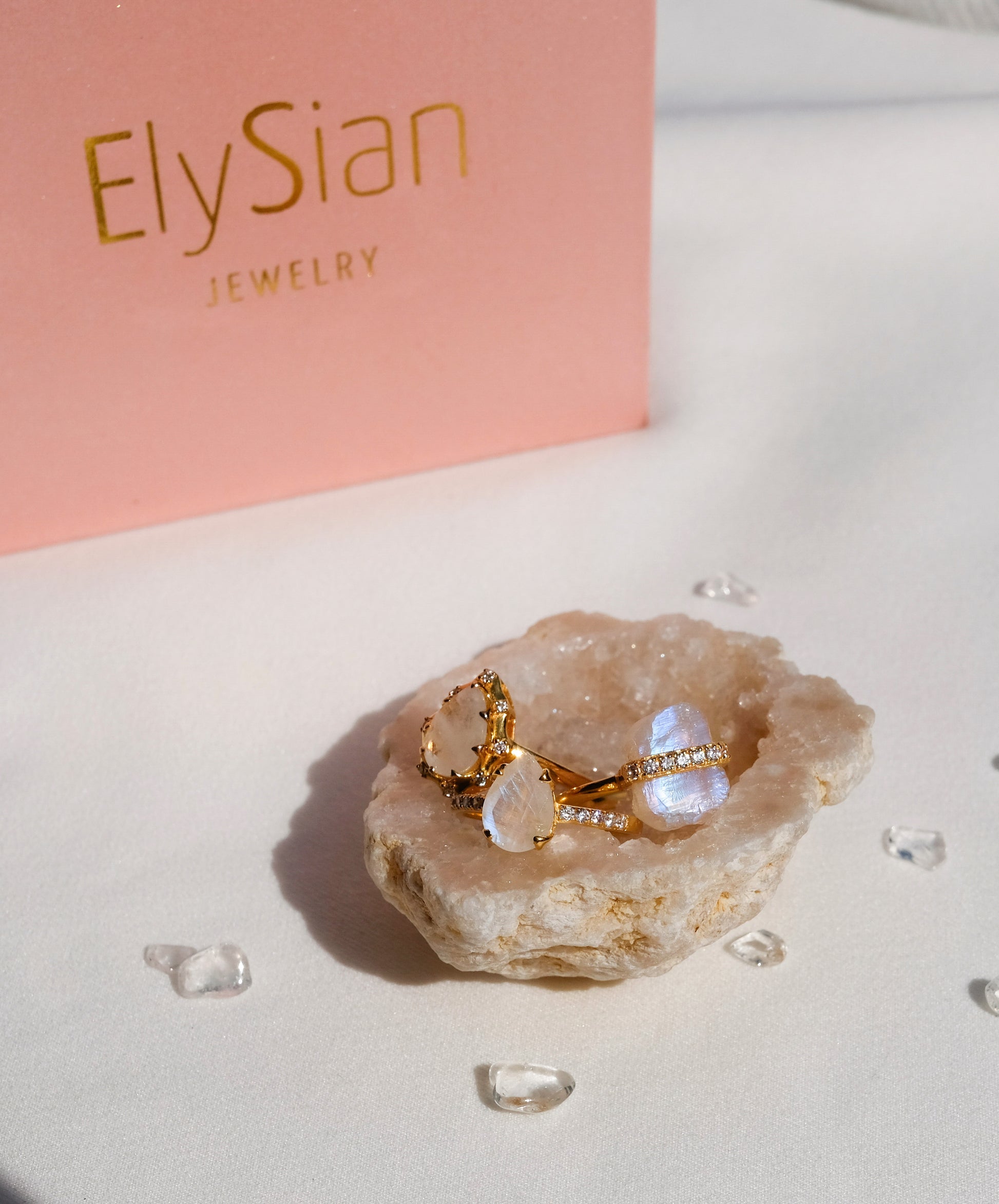 Unik månestein ring laget av 925 sterling sølv dekket med gull vermeil. Ringen har en stor rå månestein med hvite topaz-stener rundt. Månesteinen representerer intuisjon og feminine energier, mens hvite topaz-stener symboliserer klarhet og renhet.